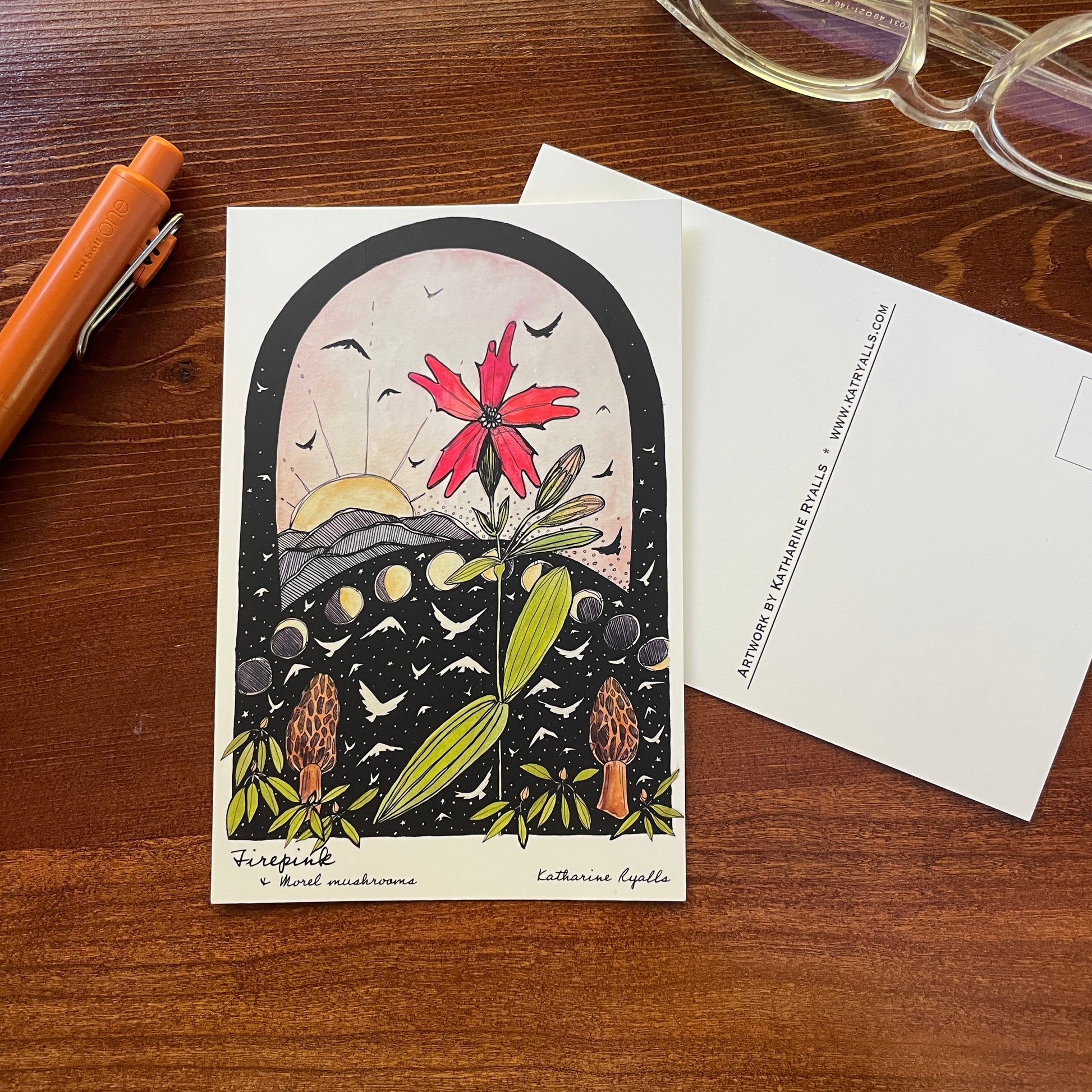 Morels and Fire Pink POSTCARD of plants and scenes the Blue Ridge Mountains